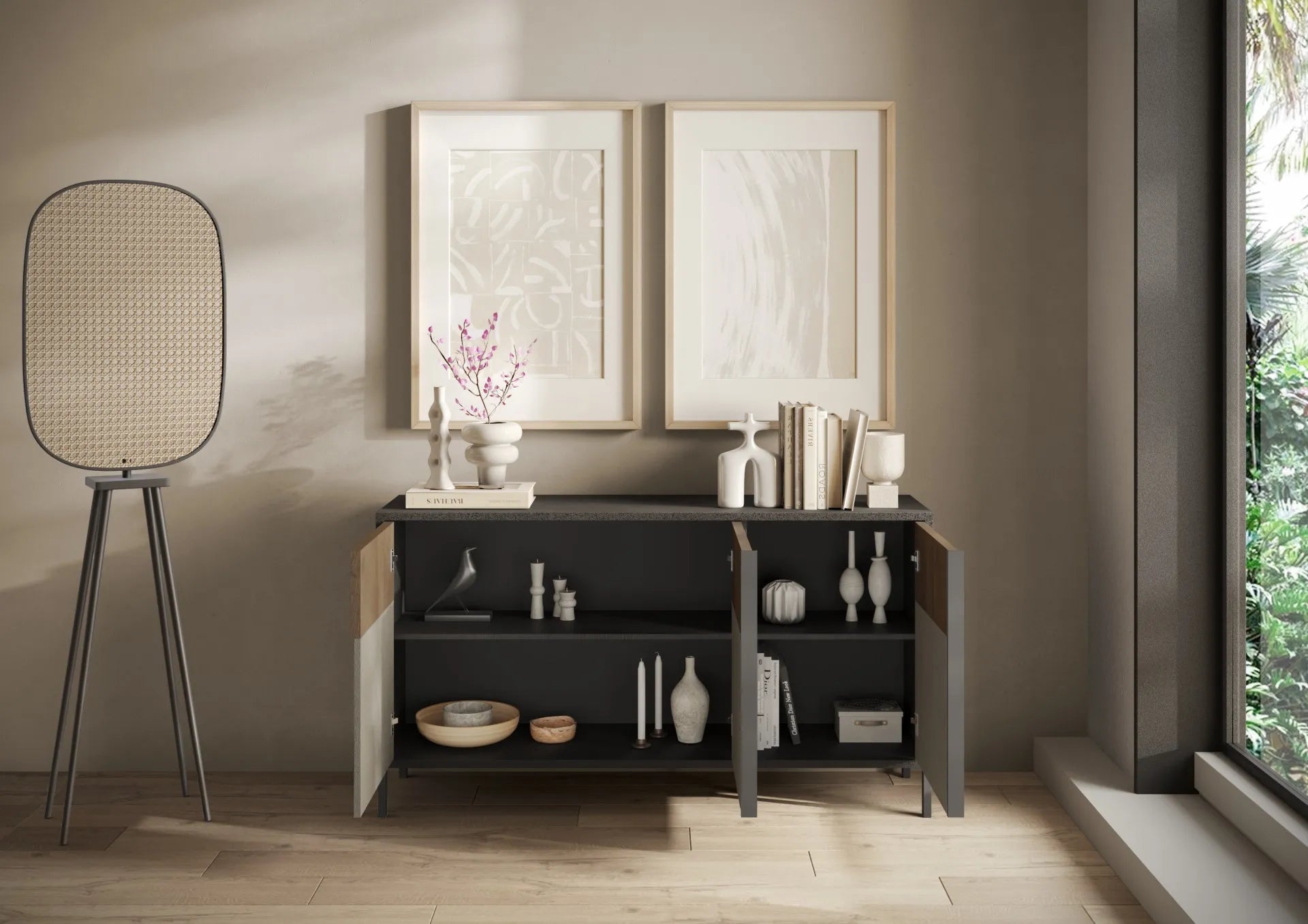 Everest 3 durvju kumode. Šai bufetei ir trīs durvis, kas eleganti paslēpj četras praktiskas uzglabāšanas vietas. Izstādiet savus skaistākos interjera dekorus un augus uz kumodes virsmas.
