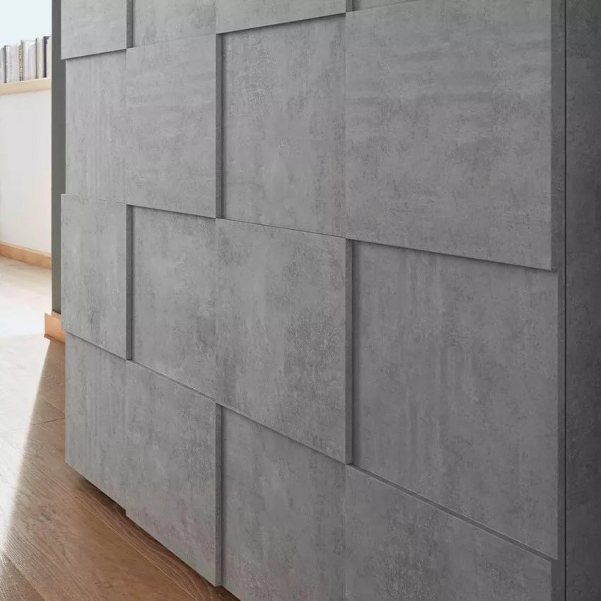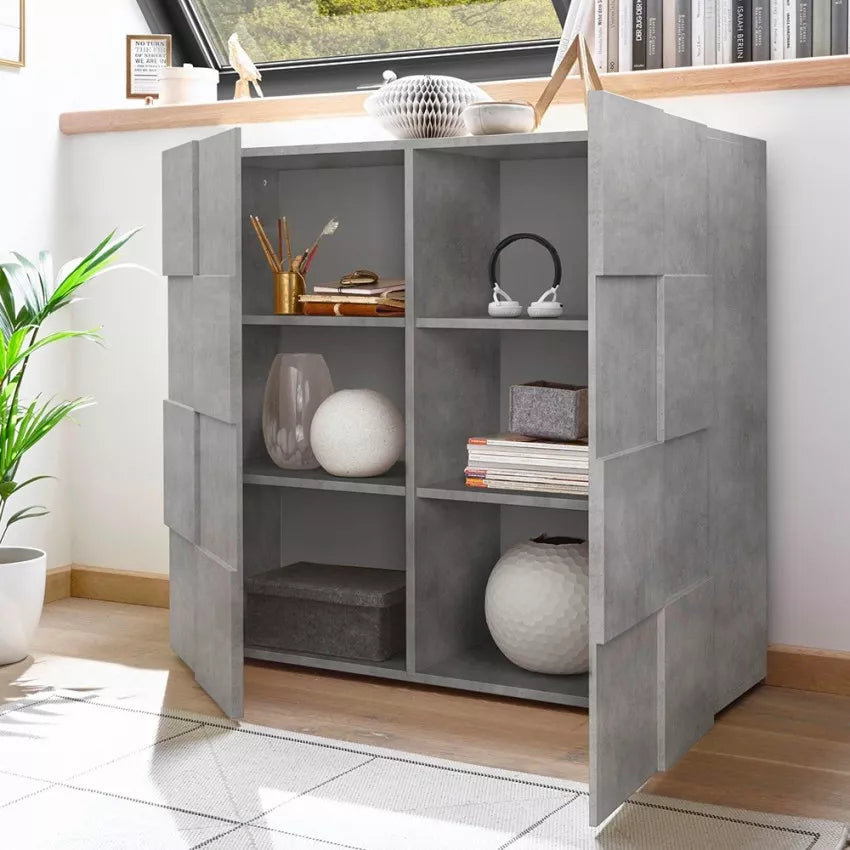 Augsta lamināta kumode ar 2 durvīm un ietilpīgiem nodalījumiem. Pieejama spīdīgi baltā, pelēkā, betona imitācijā vai ozola krāsas apdarē.