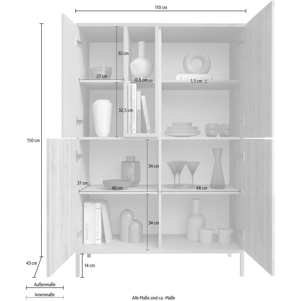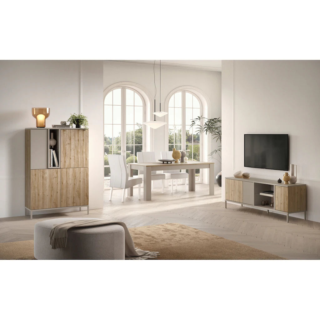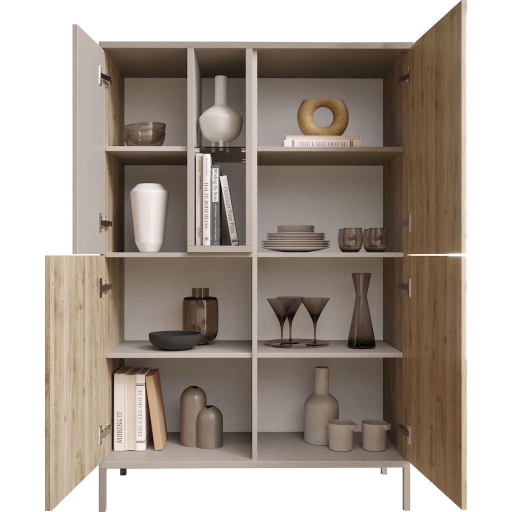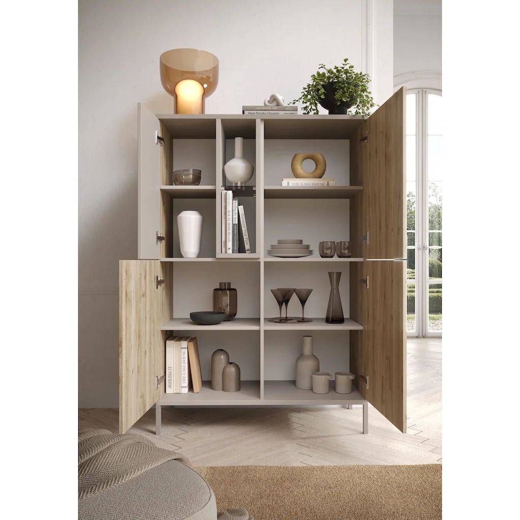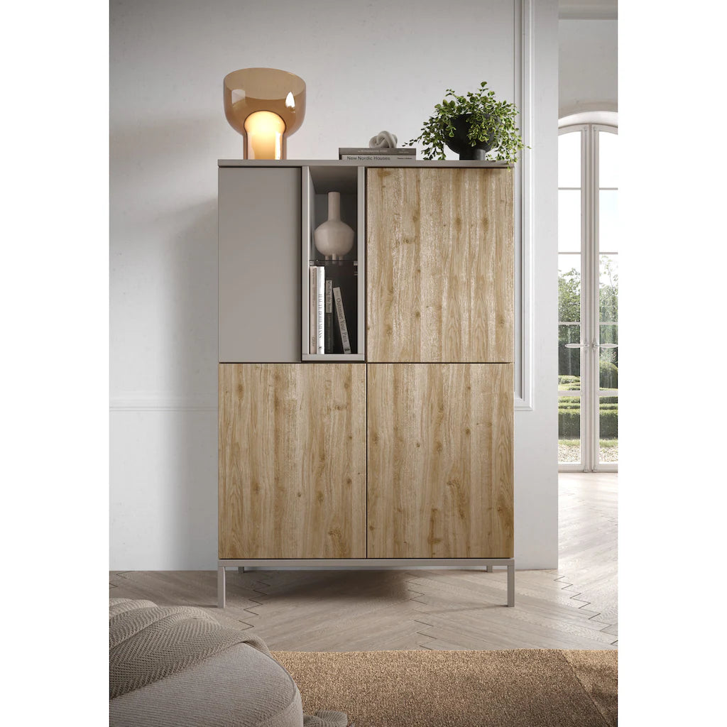 Augstā kumode kašmira un gaiša ozola krāsā ar 4 durvīm un 2 atvērtiem nodalījumiem.