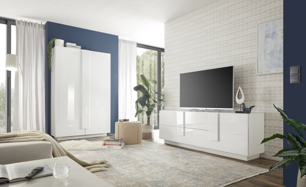 Augstā kumode JUPITER koka vai spīdīgi baltā krāsā ar divām durvīm un ietilpīgiem nodalījumiem.