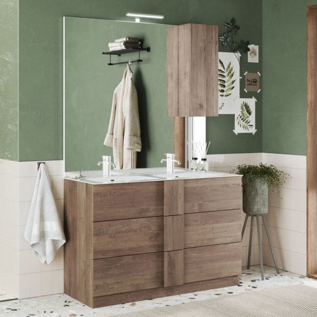 Izlietnes skapītis ar divām izlietnēm. Skapītī 3 ietilpīgas atvilktnes dažādu vannas istabas priekšmetu uzglabāšanai.
