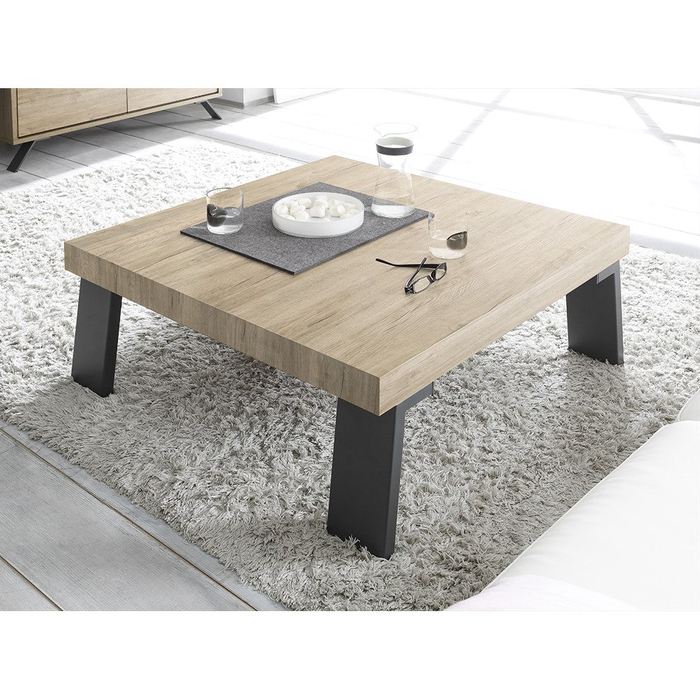 Moderns lamināta kafijas galdiņš ozolkoka krāsā uz metāla kājām.