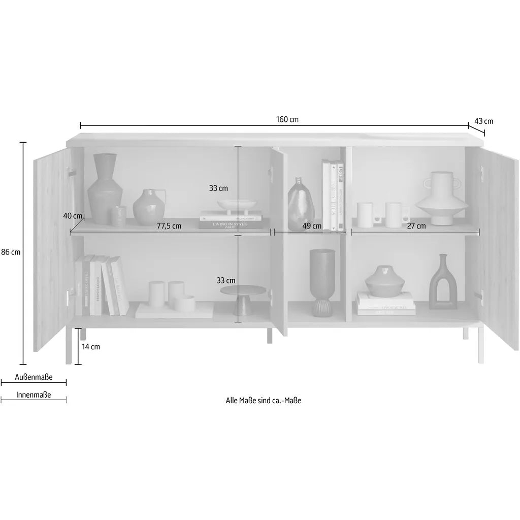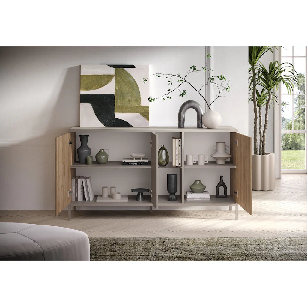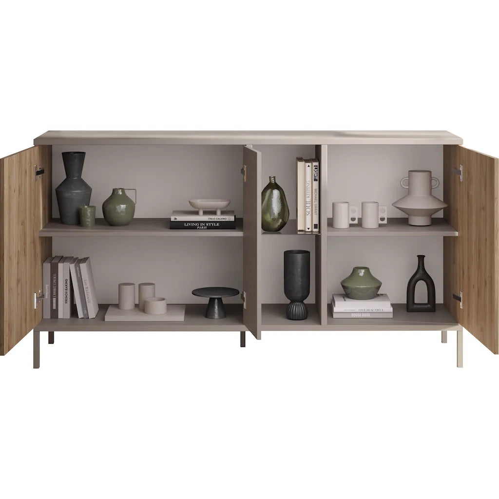 Kumode kašmira un gaiša ozola krāsā ar 3 durvīm un 2 atvērtiem nodalījumiem.