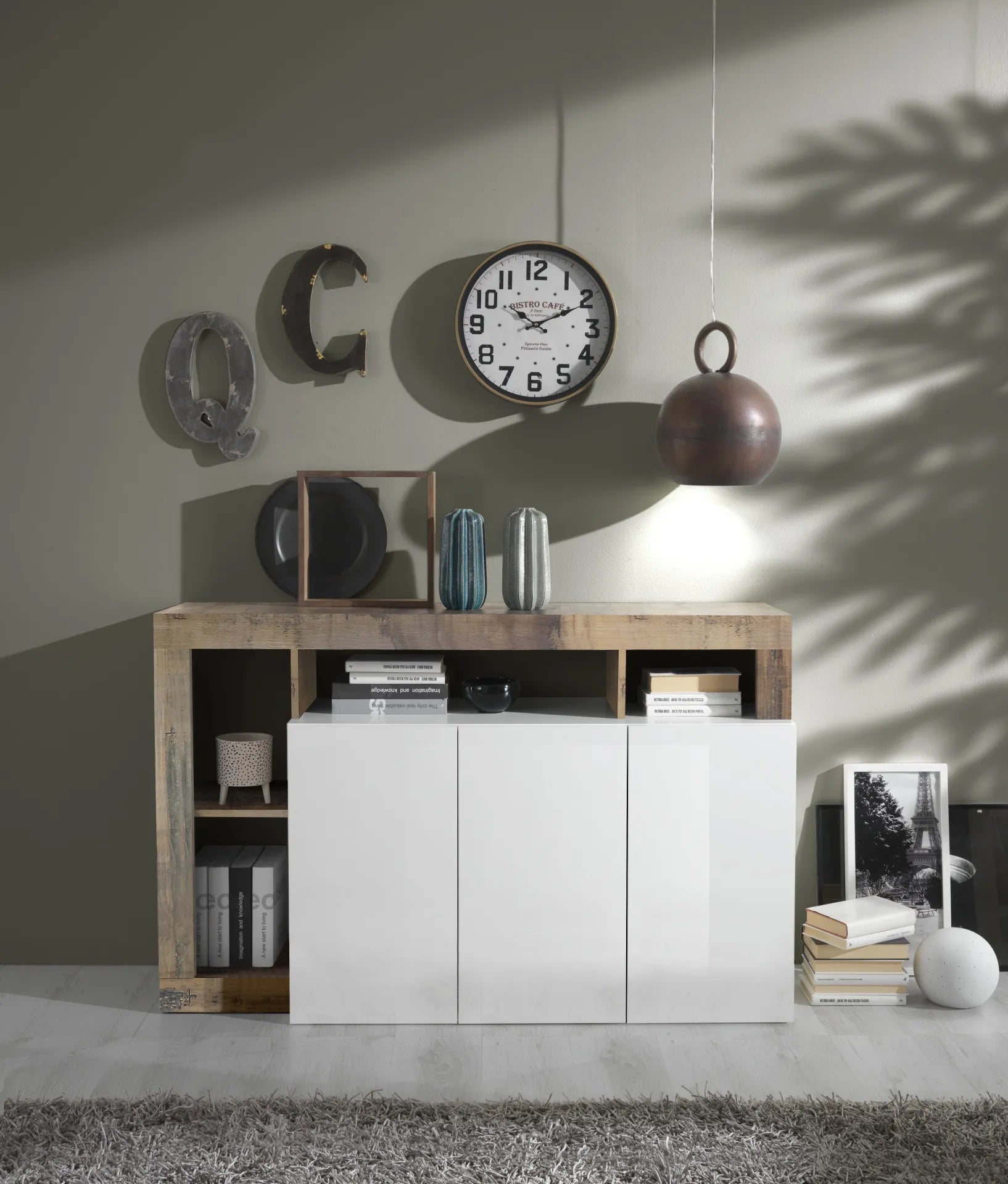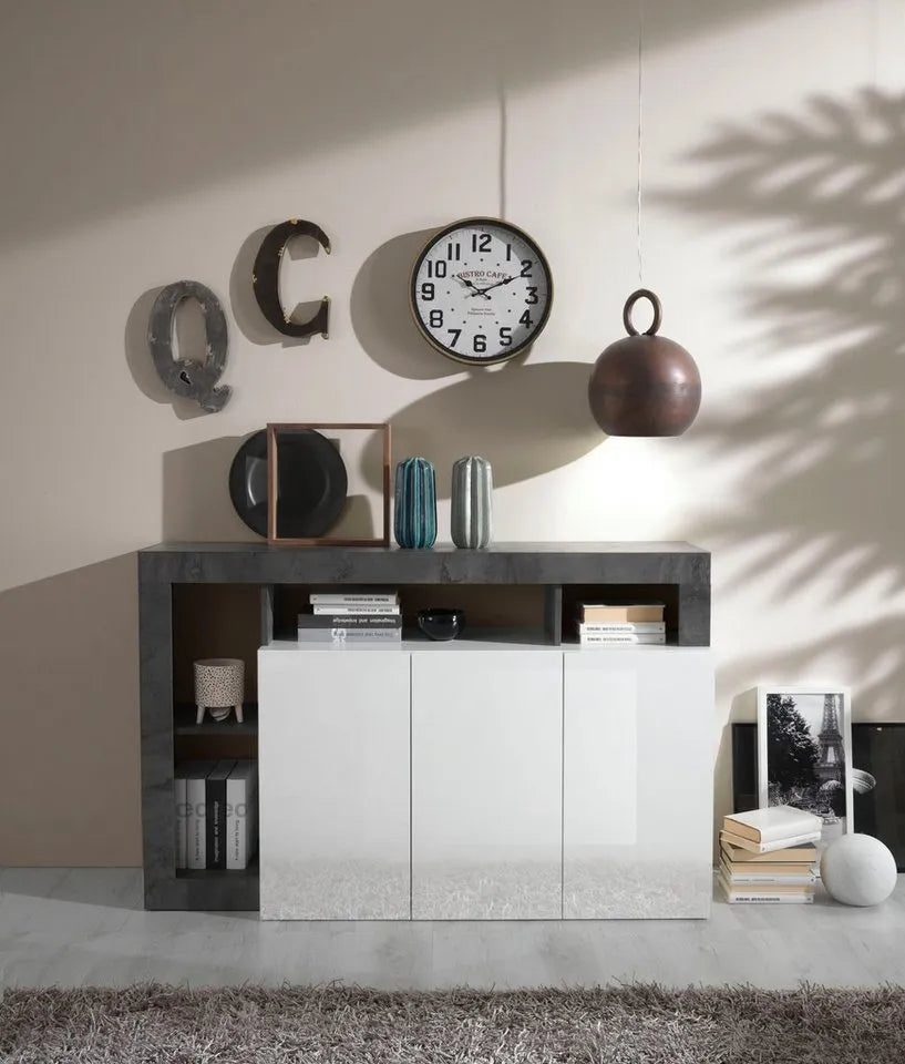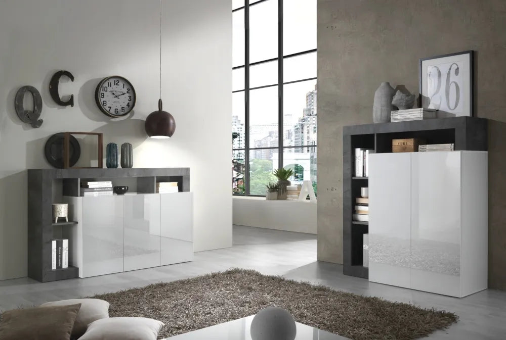 Moderna kumode ar 3 durvīm no balta spīdīga lamināta.