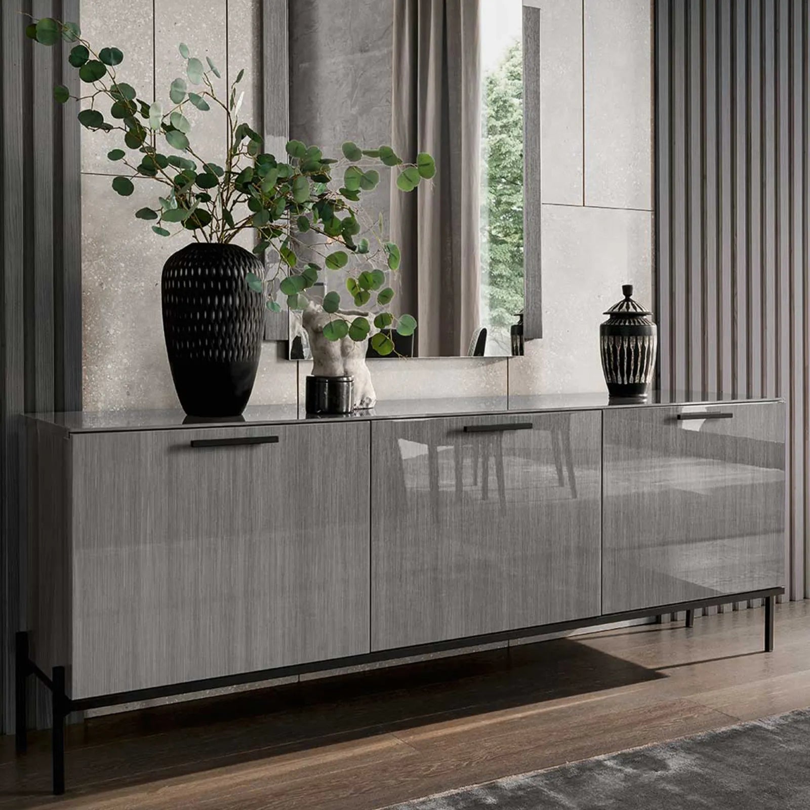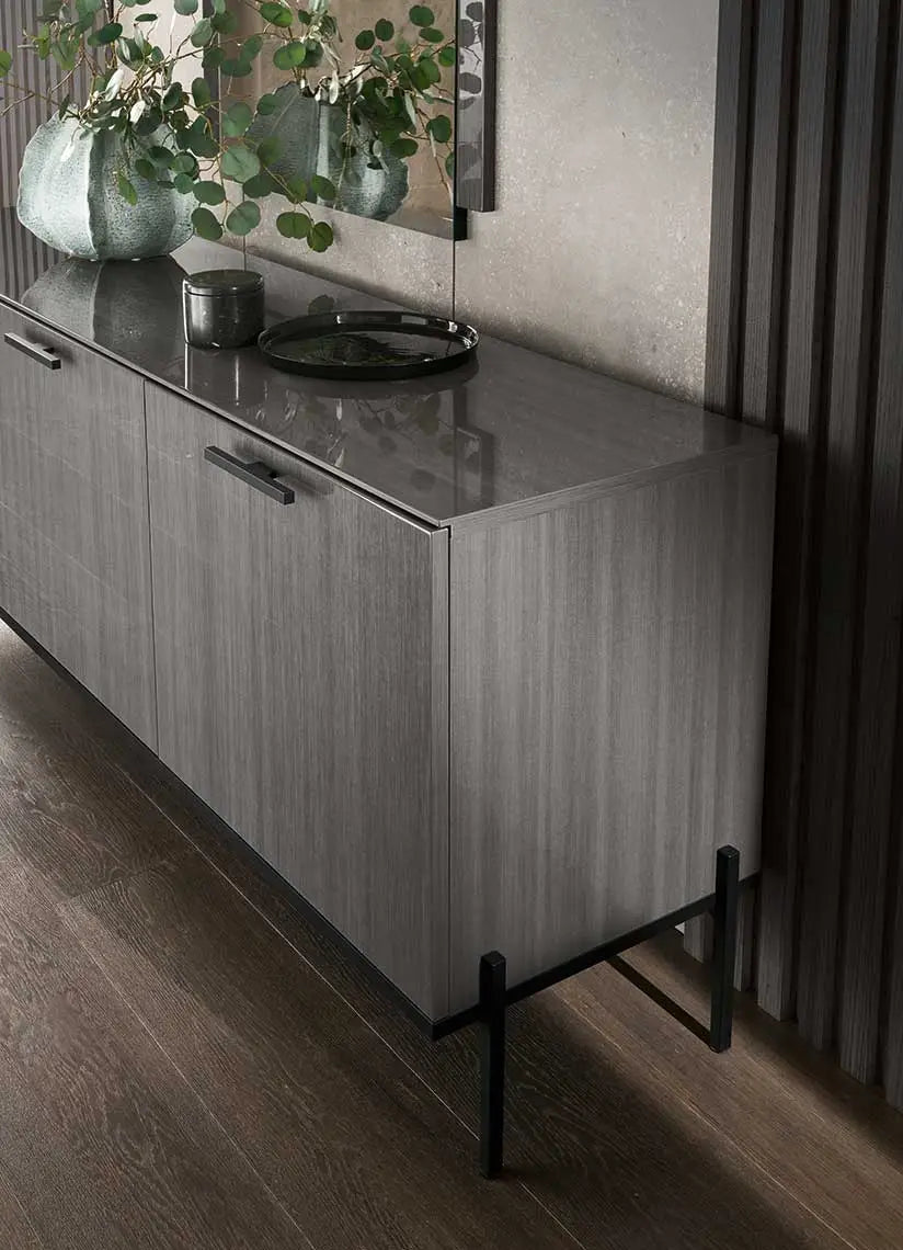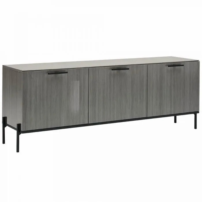 Spīdīga 3 durvju kumode divos izmēros ar metāla rokturīšiem un metāla kājiņām. Aiz durtiņām iekšēja atvilktne.