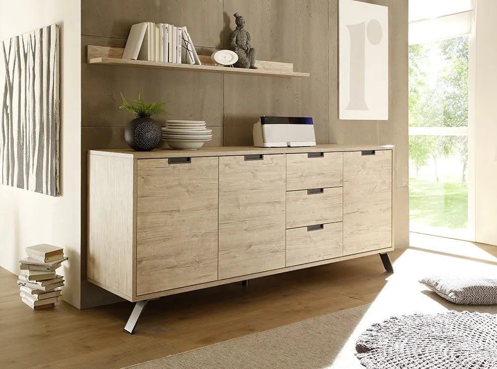 Daudzpusīga kumode, kuru var izmantot viesistabā, guļamistabā, kā bāru, grāmatu plauktu vai pat kā multivides konsoli. Varat izmantot augšējo virsmu, lai izstādītu savus iecienītākos interjera dekorus.