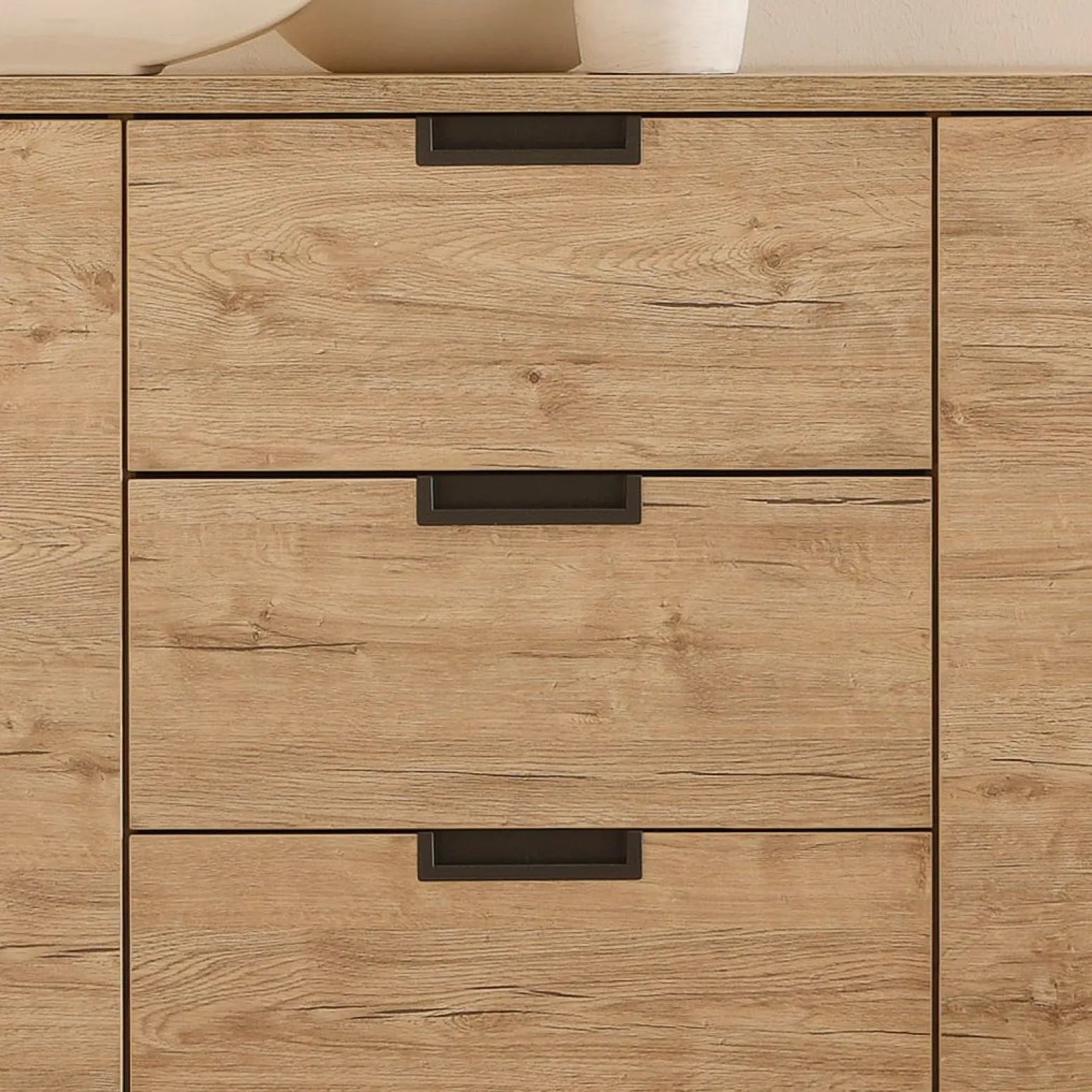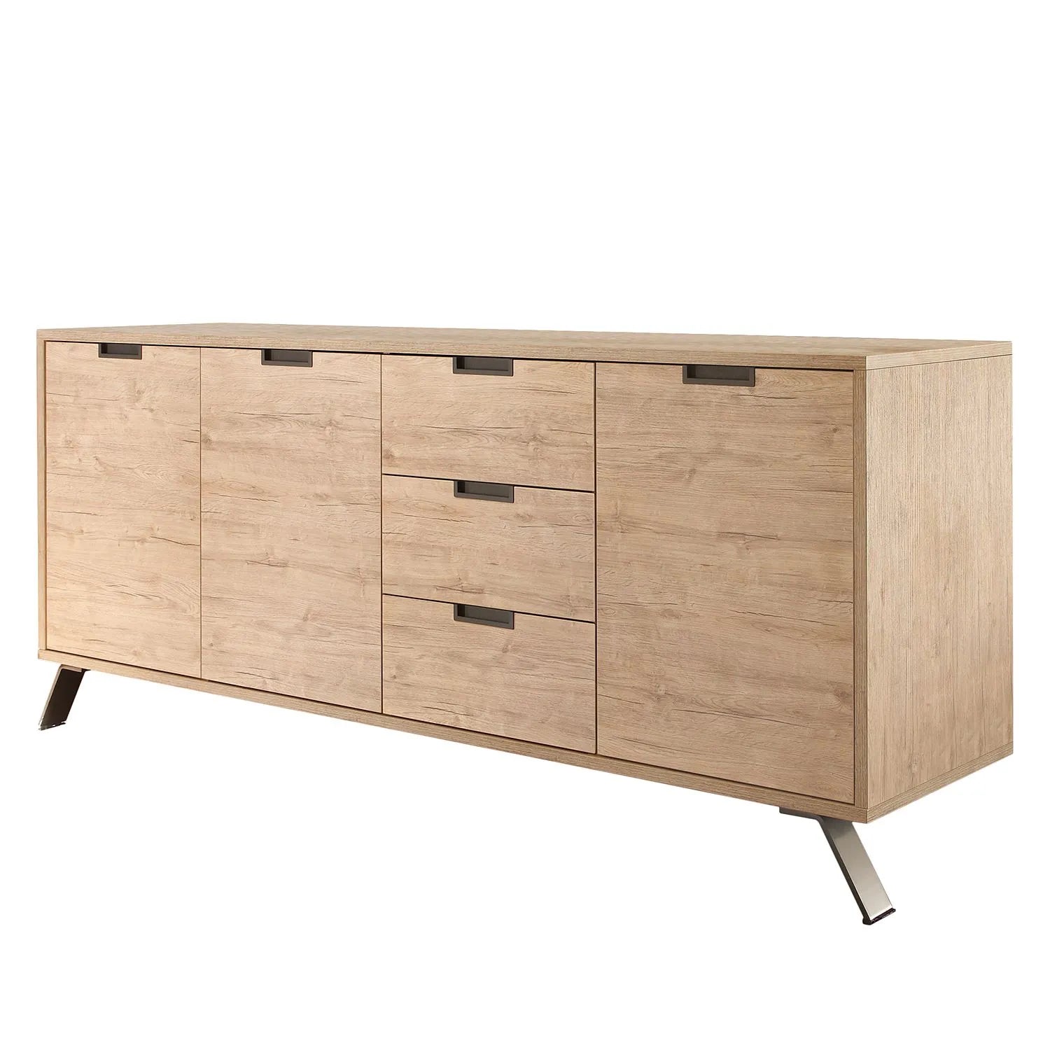 Lamināta kumode ar 3 durvīm un 3 atvilktnēm uz metāla kājiņām.