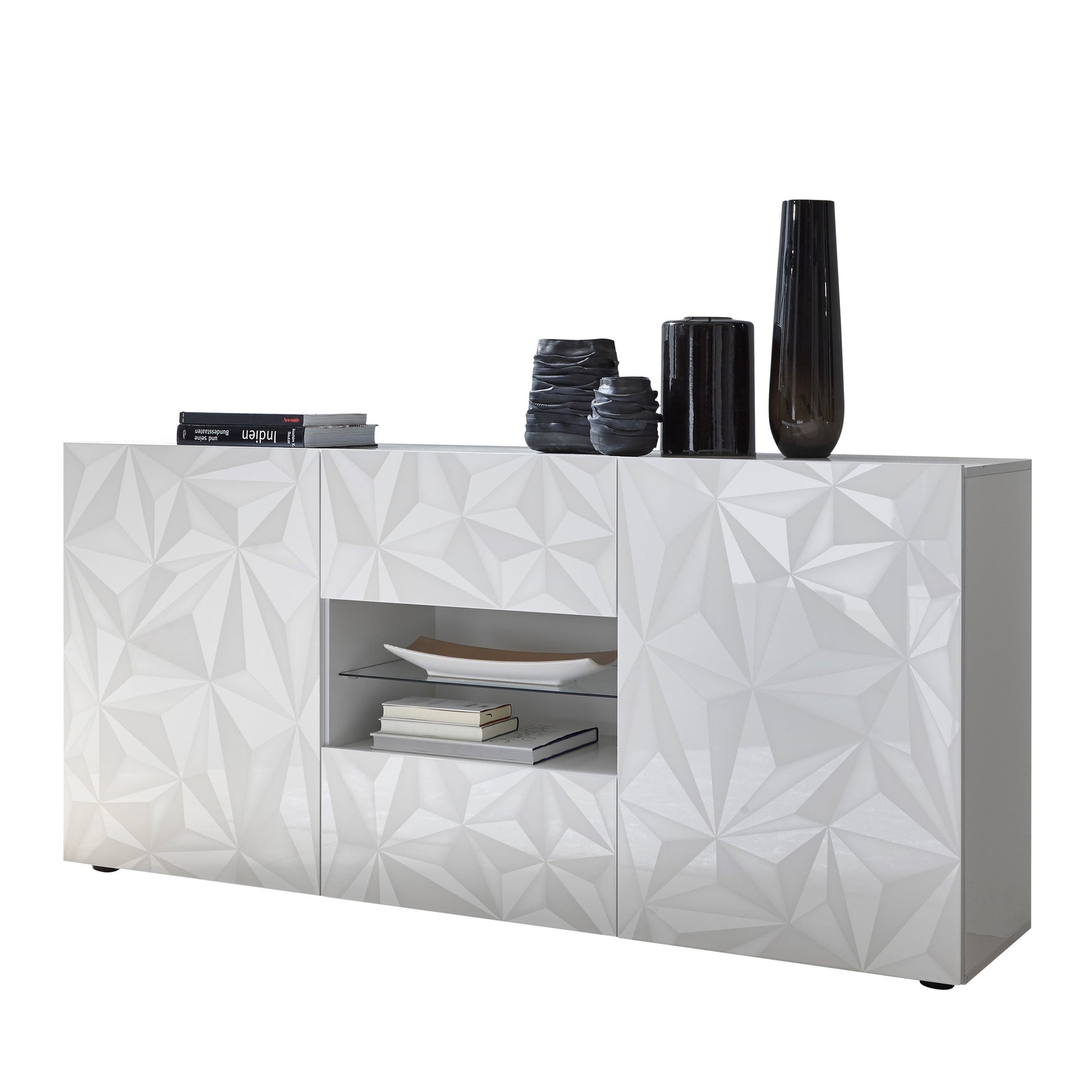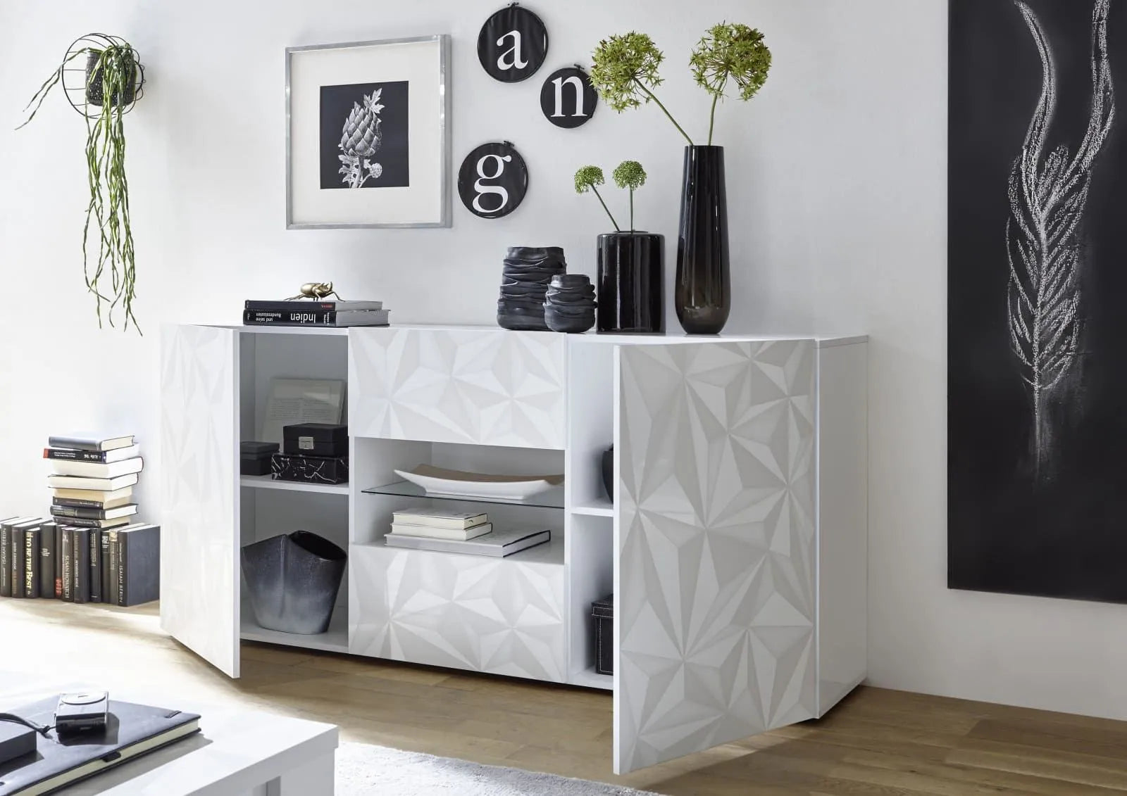 Kumode ar 2 veramām durtiņām, 2 atvilktnēm un stikla plauktiņu. Matēta un spīdīga lamināta kombinācija, kas izveido 3D rakstu.