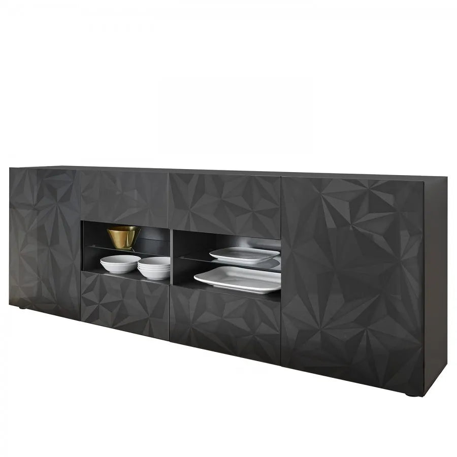 Kumode ar 2 veramām durtiņām, 4 atvilktnēm un stikla plauktiem. Matēta un spīdīga lamināta kombinācija, kas izveido 3D rakstu.