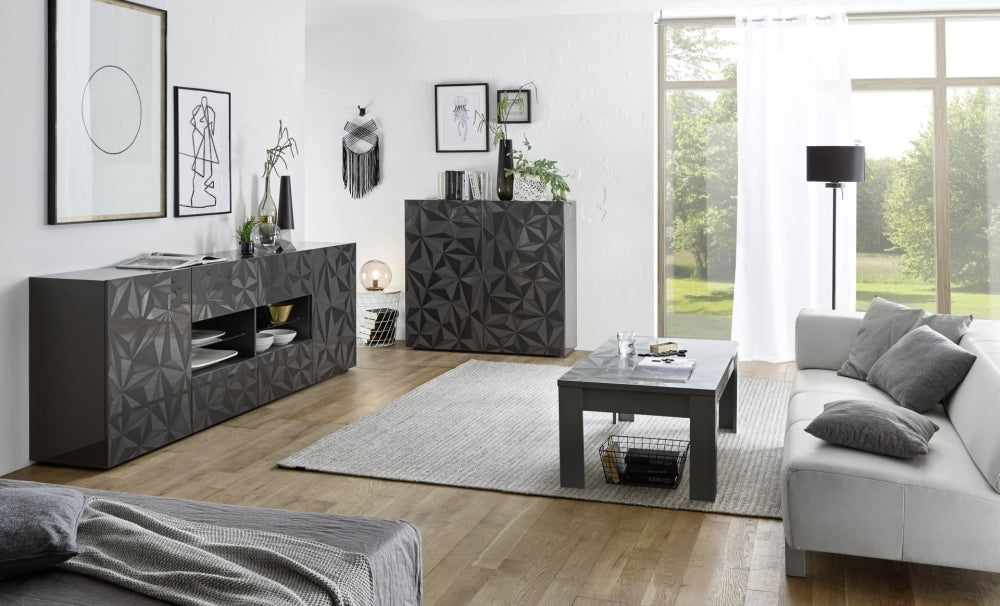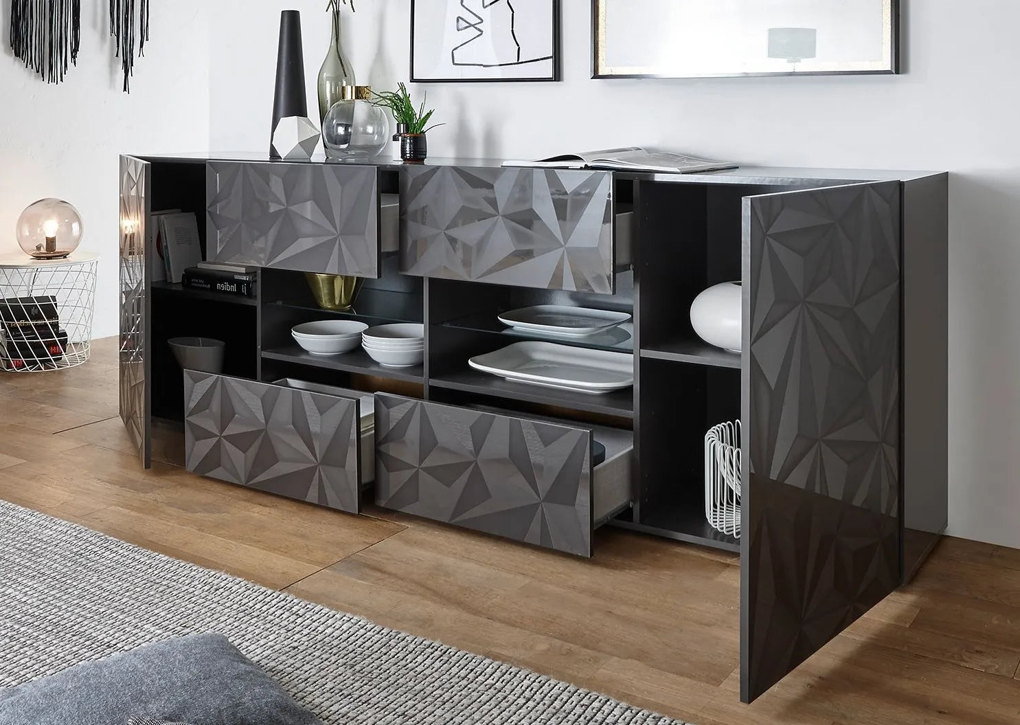 Kumode PRISMA durtiņas ar 3D raksta ilūziju spīdīgi baltā vai spīdīgi pelēkā krāsā būs funkcionāls un stilīgs papildinājums jūsu ēdamistabas vai viesistabas interjeram.