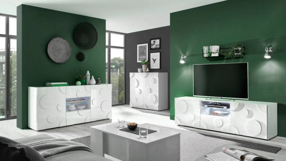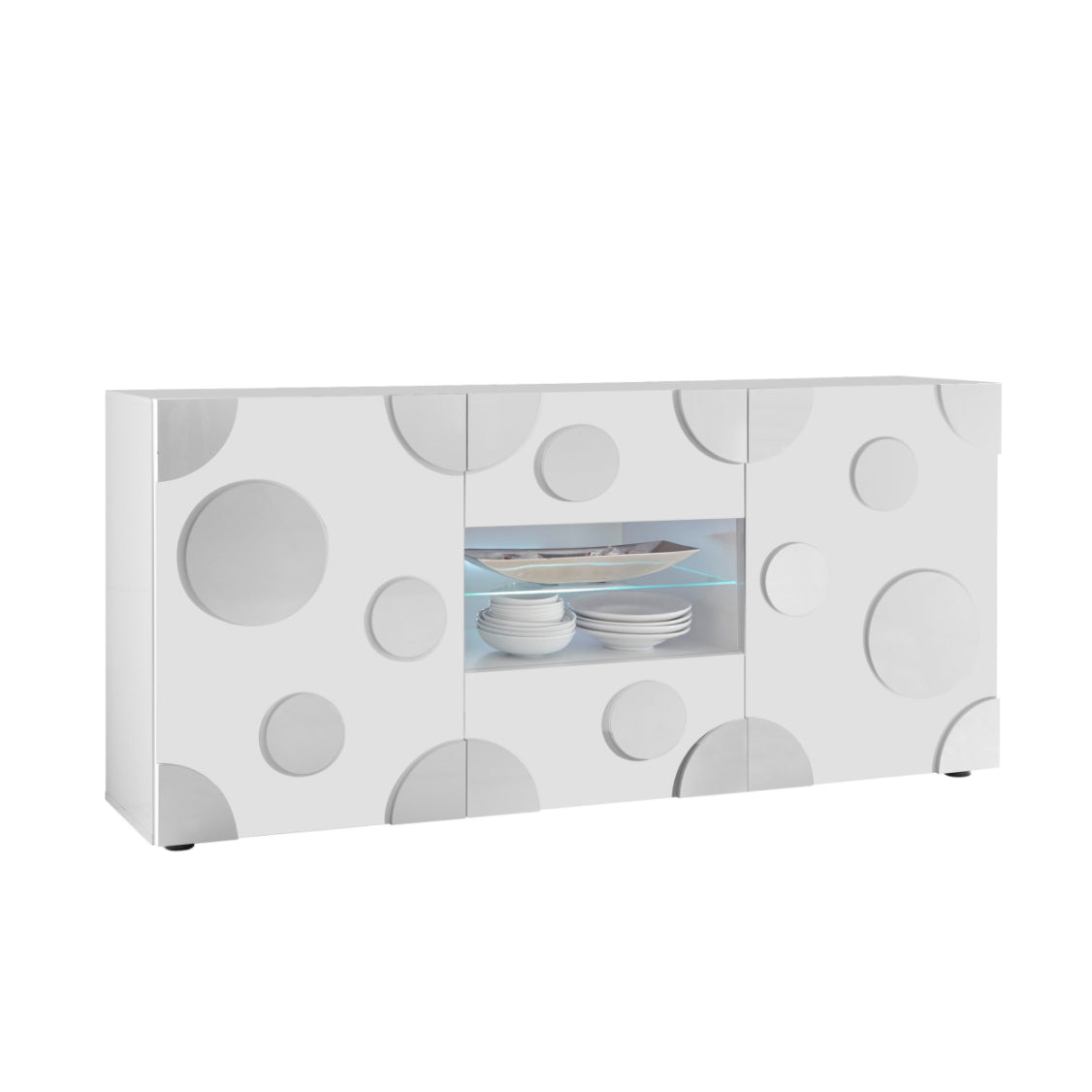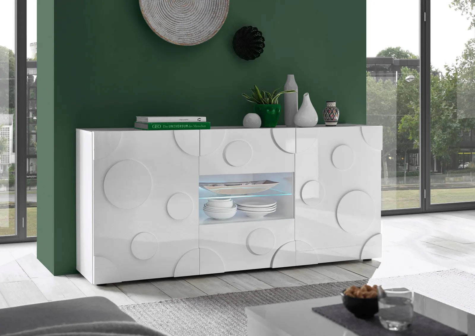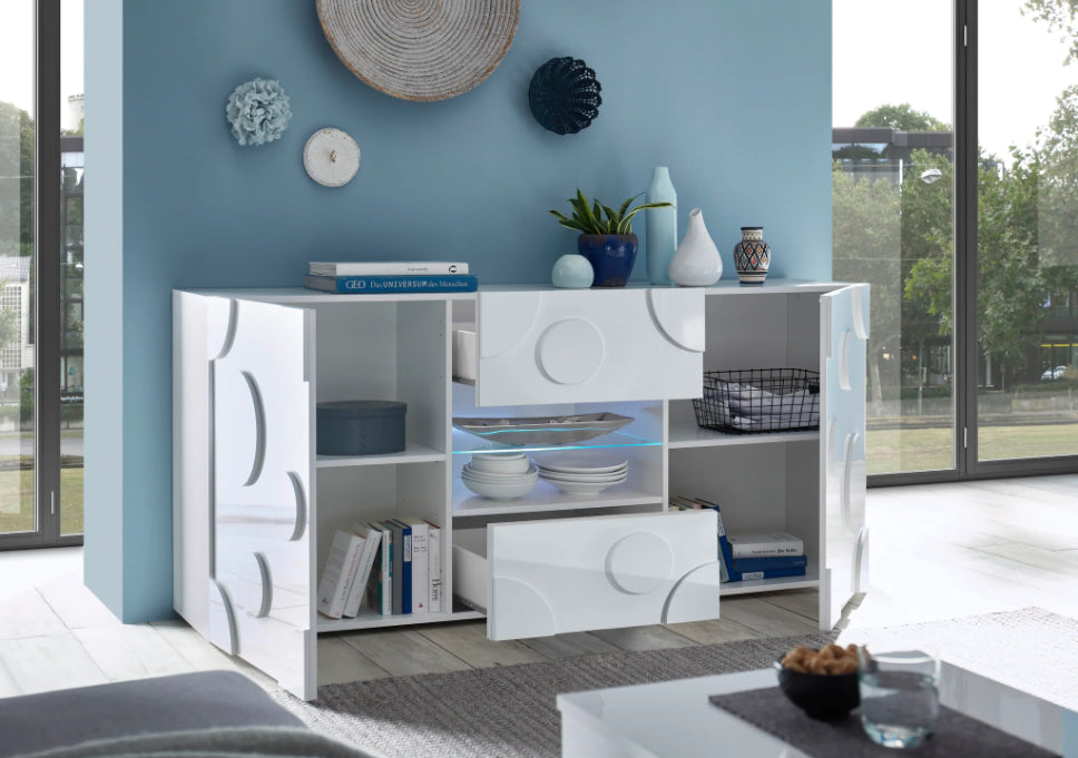 Spīdīga balta lamināta kumode ar 2 durvīm, 2 atvilktnēm un plauktu ar stikla nodalījumu.