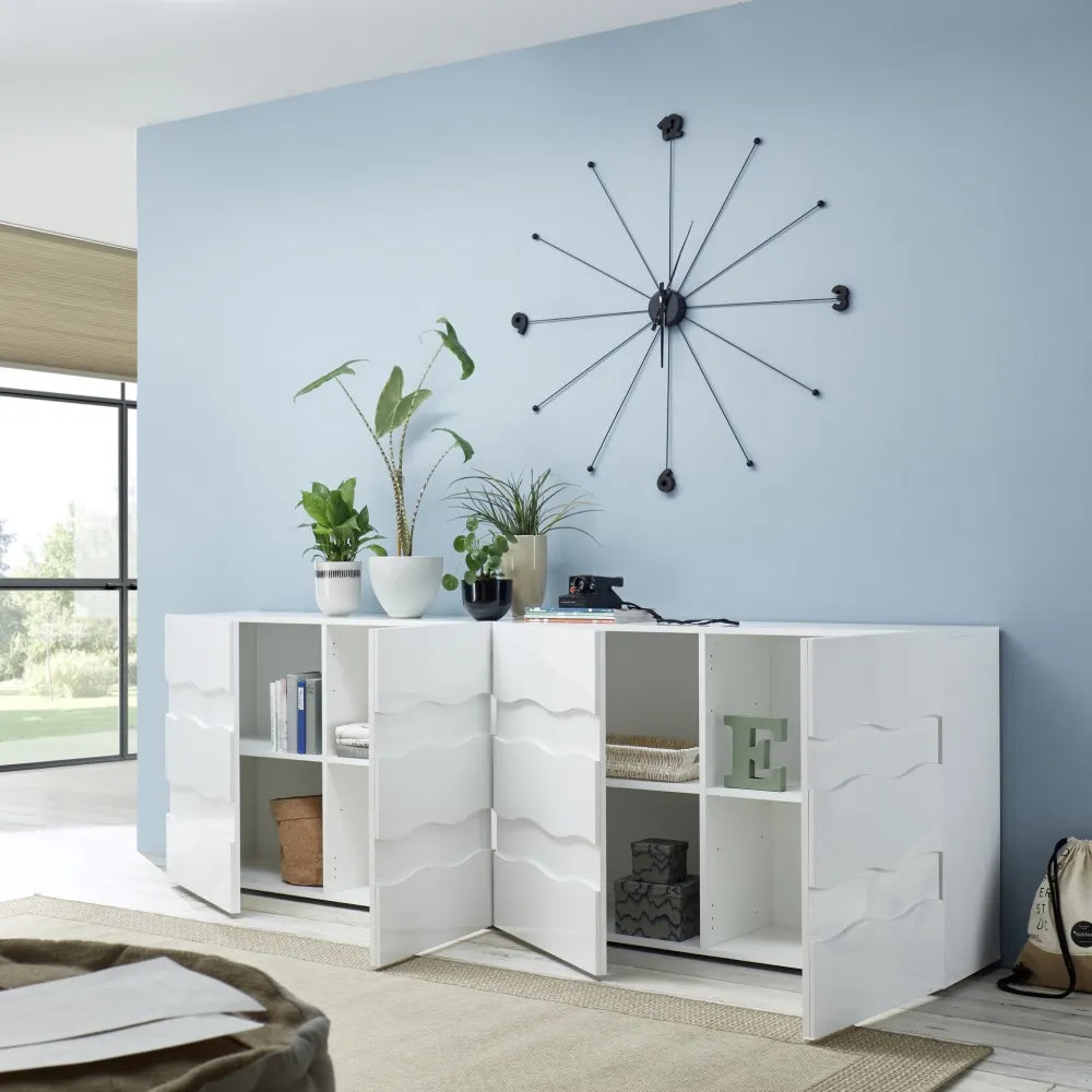 Moderna un ietilpīga balta spīdīga 4 durvju kumode ar viļņotām durvīm. Pieejama arī ar atvilktnēm un stikla plauktiem.