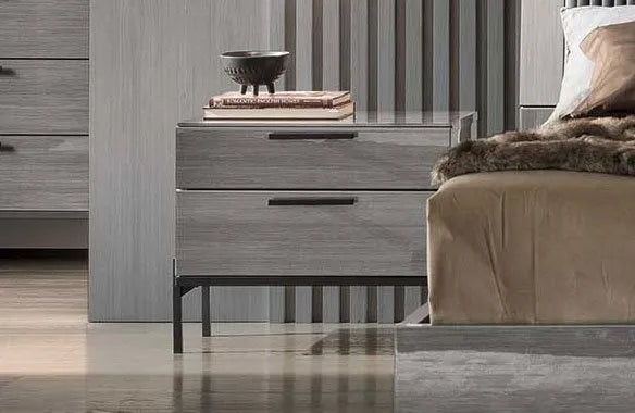 Spīdīgs naktsskapītis pelēkā krāsā ar divām atvilktnēm. Metāla rokturīši un metāla kājiņas.