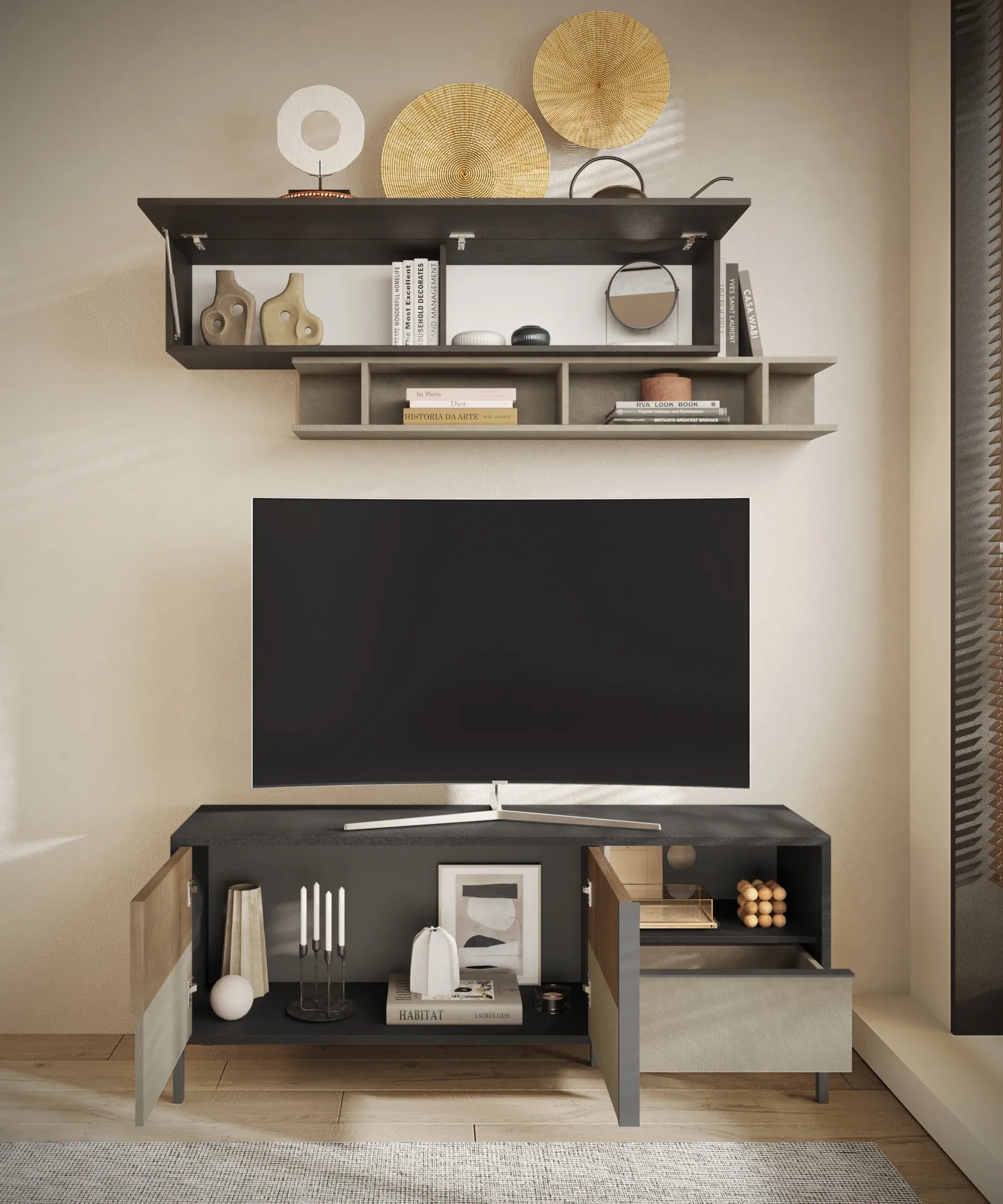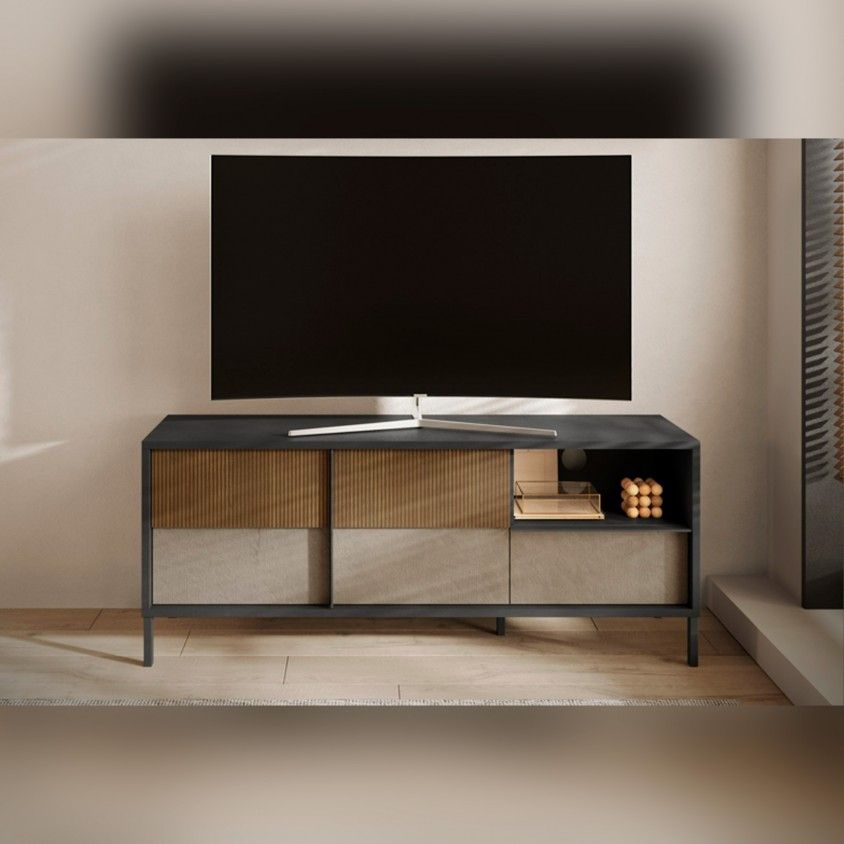 Everest 2 durvju TV galds/ zemā kumode pieejama divos izmēros. TV galdam ir divas durvis, kas paslēpj ietilpīgu glabāšanas vietu. Labajā pusē ir atvērta uzglabāšanas niša un atvilktne. Nišas aizmugurē atradīsiet ērtu caurumu kabeļu maršrutēšanai.