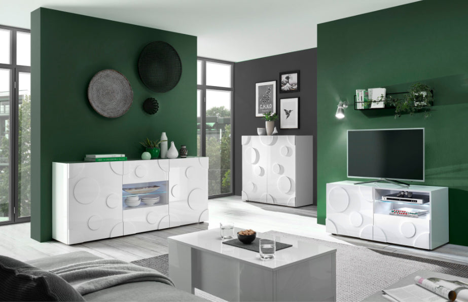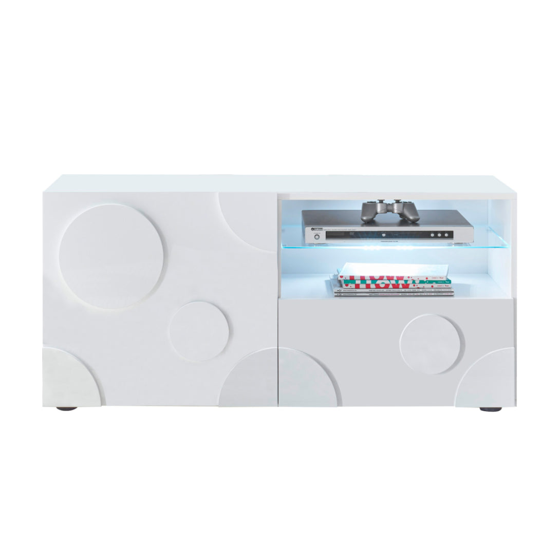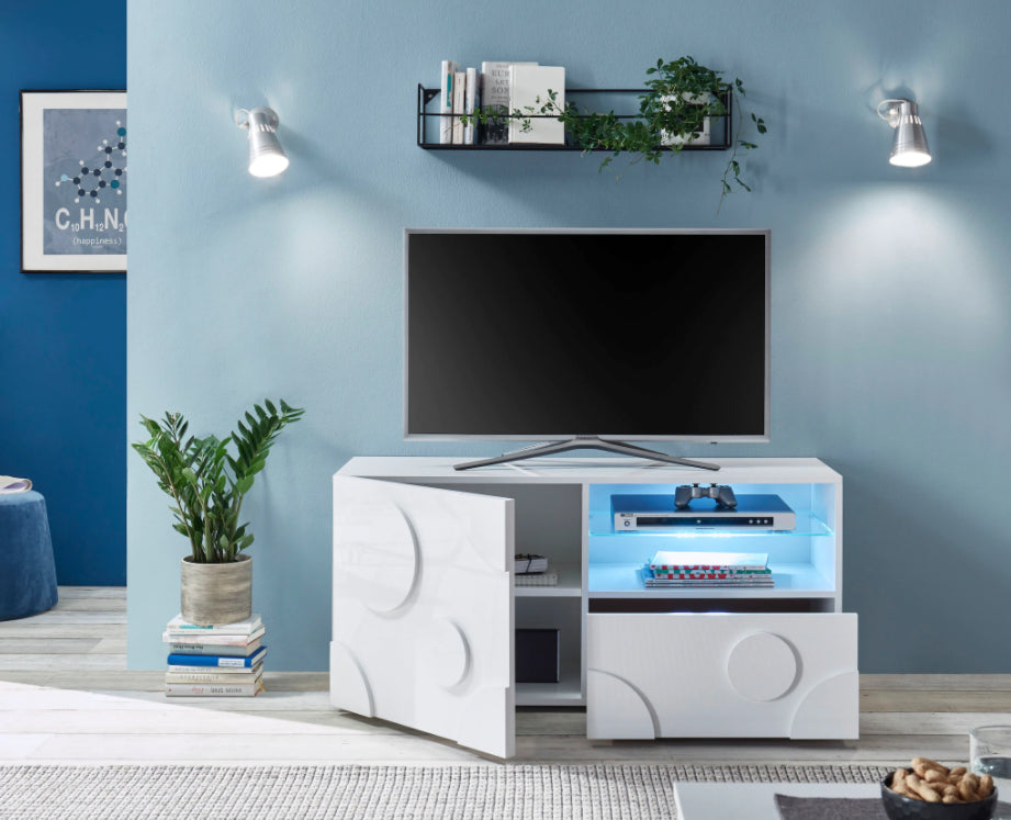 TV galdiņš no balta spīdīga lamināta ar durtiņām, 1 atvilktni un plauktiņu ar stikla nodalījumu.
