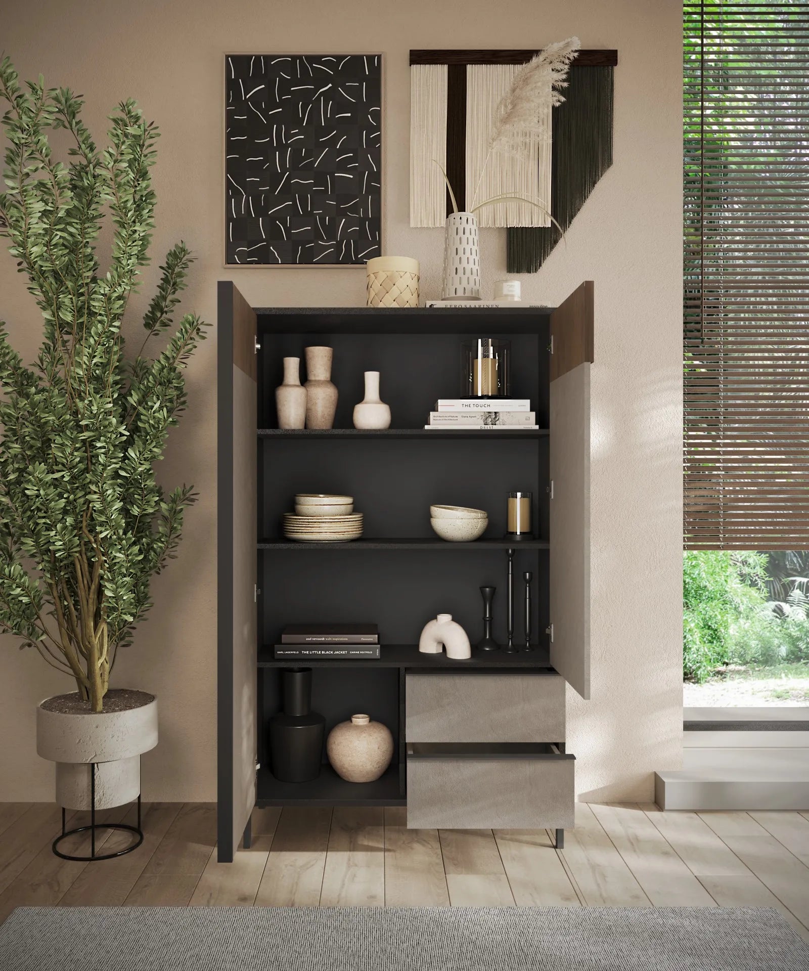 Augstā kumode EVEREST ar divām atvilktnēm un divām durvīm, aiz kurām ir trīs plaukti un apakšējā uzglabāšanas vieta. Durvīm un atvilktnēm ir mīkstas aizvēršanas mehānismi.