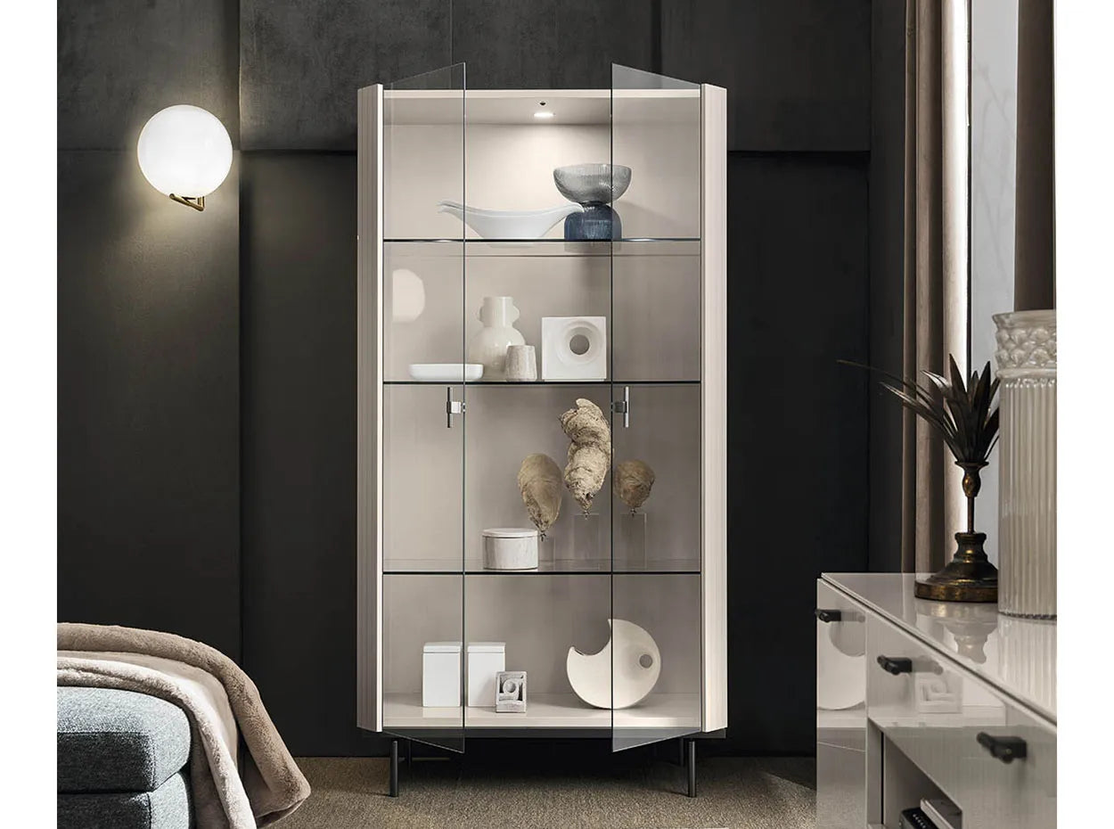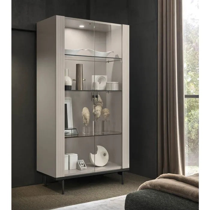 Spīdīga vitrīna bēšā pērļu krāsā ar stikla durvīm.